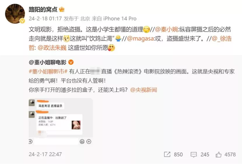 在《热辣滚烫》上映期间,有网友在平台上直播电影放映的画面,引发导演路阳的转发,表示“文明观影,拒绝盗摄。这是小学生都懂的道理。”
