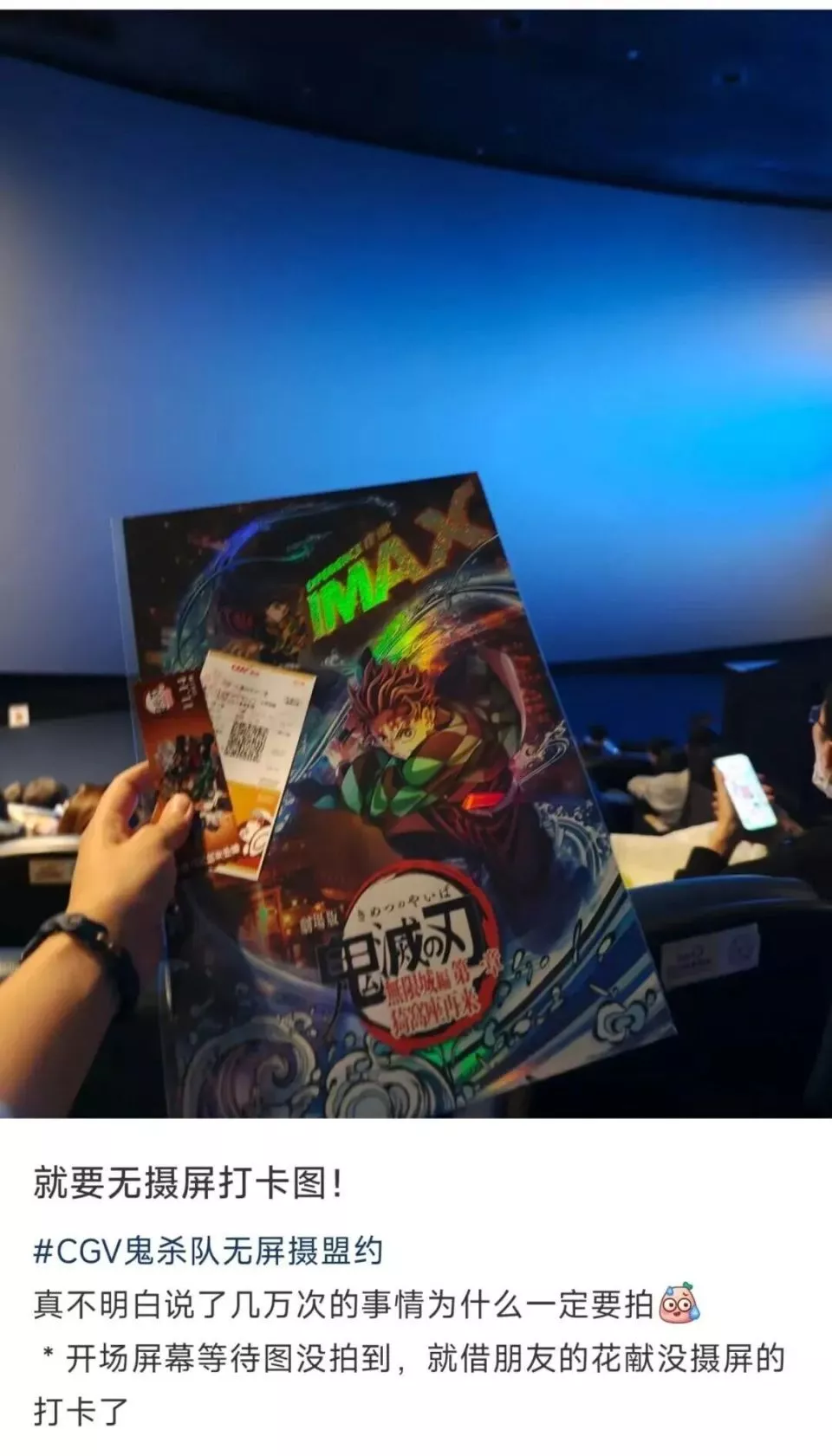记录在场的方式也有很多种,拍摄票根、影院门口的海报和易拉宝,都是一种记录方式,而不必依赖“屏摄”画面。