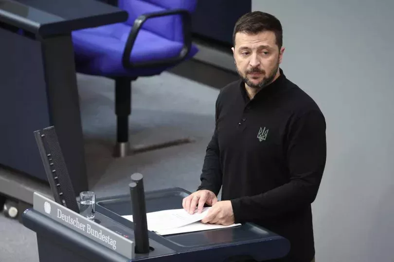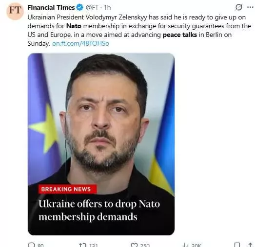 乌克兰总统泽伦斯基于柏林会谈前宣布重大政策转向,放弃北约梦改寻西方安全保障。(图/X,@FT)