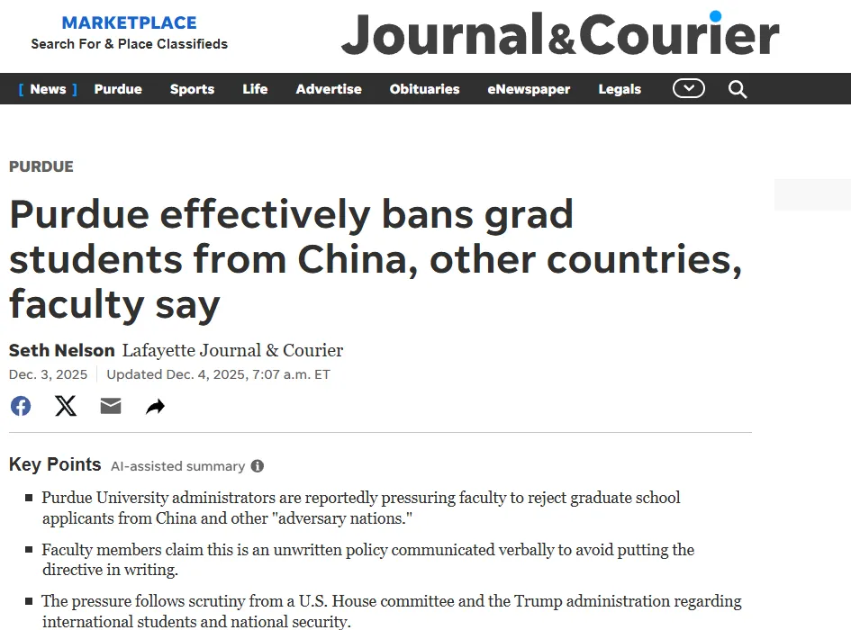 近日,普渡大学被曝禁收中国学生,一时之间炸翻了留学圈。起因是一家名叫《Journal & Courier》的媒体网站发布了一篇文章,文中提到了普渡大学的教职工称,校方曾指示院系避免向中国、俄罗斯、伊朗、古巴、朝鲜这几个国家的学生发录取通知。