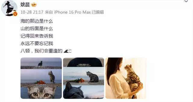 不过,在今年10月八顿去世了,当时姚晨还发了一条动态,她写道:“海的那边是什么,山的后面是什么,记得回来告诉我,永远不要忘记我,八顿,我们会重逢的。”