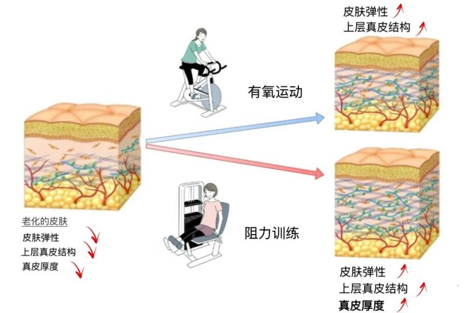 阻力训练组和有氧运动组都显著改善了皮肤弹性和上层真皮结构,更厉害的是,阻力训练还能改善真皮厚度。
