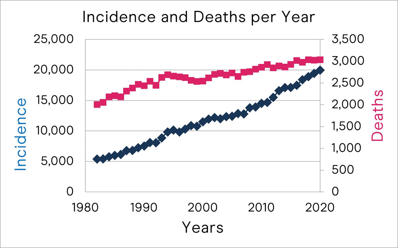 回到正题,到底什么是癌症呢?简单的说,癌症是对恶性肿瘤疾病的统称。在人类的历史长河中,这些恶性肿瘤疾病其实有着许多的记录,可是为什么只是在最近的半个世纪,才得到我们越来越多的关注呢?我觉得这和它这几十年来不断提高的发病率和死亡率有关系。下面这张图是近四十年来澳大利亚乳癌的发病和死亡人数,可见一斑。