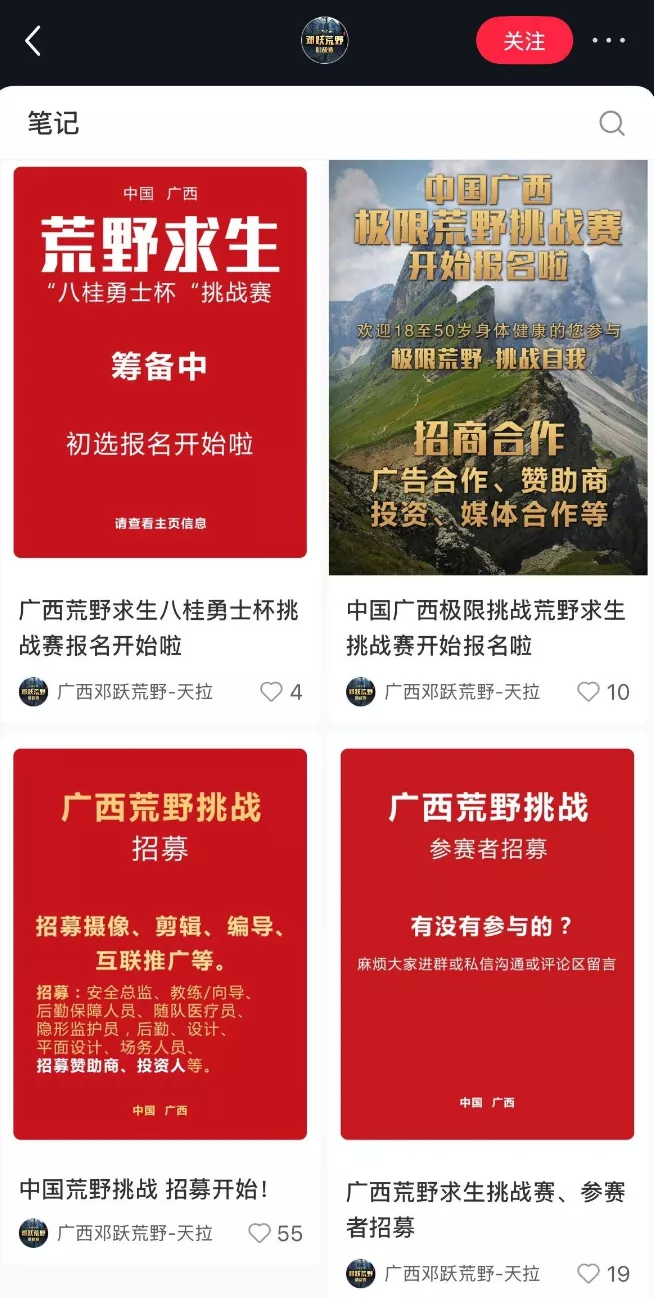 社交媒体上出现了越来越多荒野求生赛事的招募与报名信息。但如果仔细检查,会发现这些赛事组织的非常粗糙,没有详细规则,没有具体地点,也没有政府背书。点开发布者的主页,都是近期才发布了第一篇帖子——或是请人提供场地,或是找人共同参与,同时还在寻找品牌赞助。