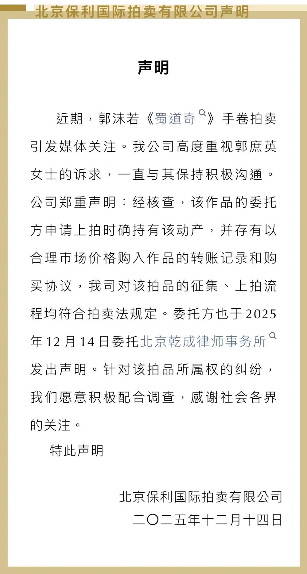近日,郭沫若书法手卷《蜀道奇》将亮相北京保利二十周年秋拍,12月16日开拍,起拍价800万元。其女郭庶英委托律师发布声明,称该作品为父亲1961年题赠自己的私藏,从未转让或授权,目前已遗失并报警,质疑拍卖为无权处分,要求保利中止拍卖、返还作品。