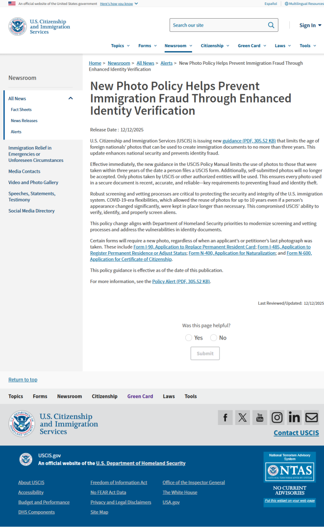 周五(12月12日),美国公民及移民服务局(USCIS)发布最新政策指导意见,正式限制用于制作移民文件的外国公民照片拍摄时间不得超过三年,同时彻底取消申请人自行提交照片的做法。