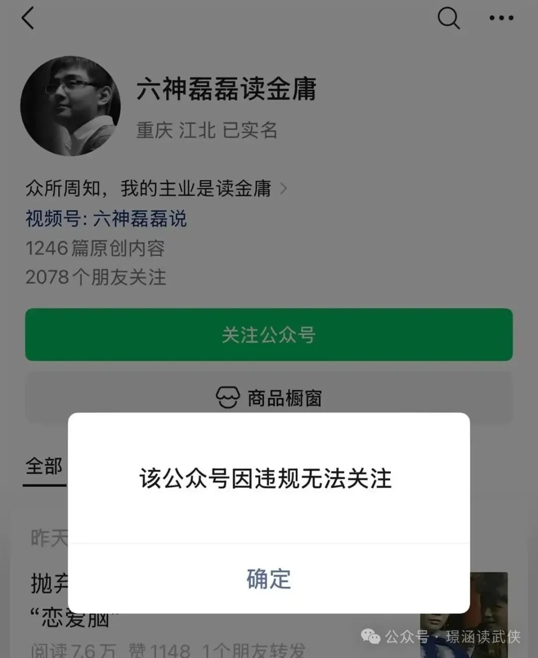 2025年12月14日中午:都市快报、极目新闻报道“六神磊磊读金庸”公众号因违规无法关注。