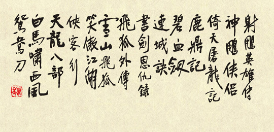 用一句诗联起来就是:“飞雪连天射白鹿,笑书神侠倚碧鸳。” 外加一部很短的《越女剑》。