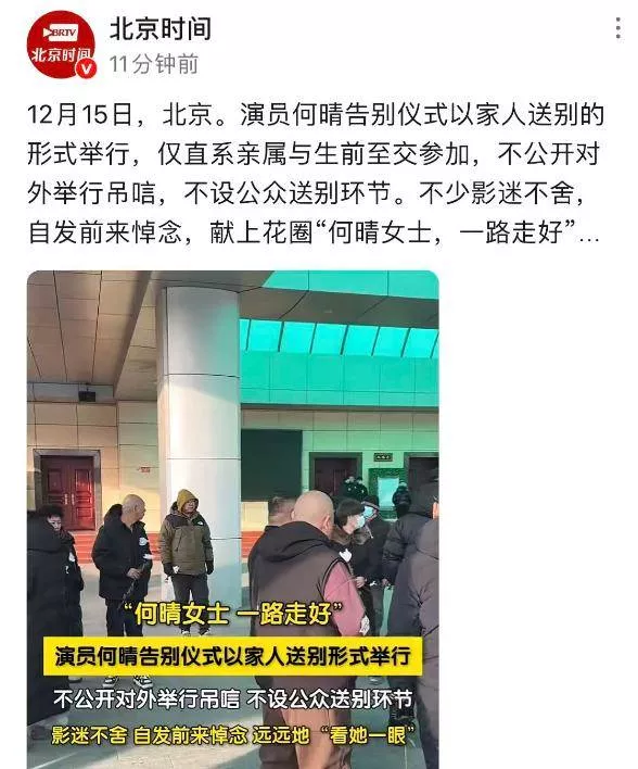 12月15日早10点,何晴的告别仪式在昌平殡仪馆久安厅举行,虽然何晴家属表示一切从简,只邀请直系亲属与生前至交参加,不公开对外举行吊唁,但还是有不少粉丝前去送别她最后一程,现场聚集了不少人。