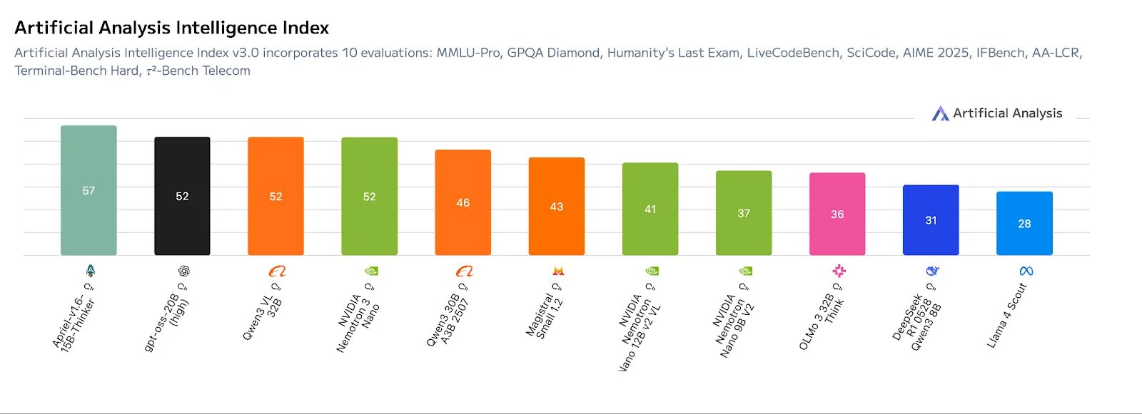 在Artificial Analysis Intelligence Index v3.0中,Nemotron 3 Nano在同规模模型中以52分排名领先。