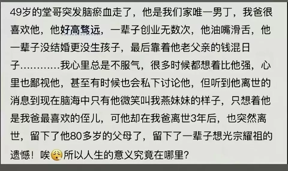 所以,我们回到堂妹的问题:人生的意义究竟在哪里?也许,那意义不在于完成他人赋予的宏伟使命,而在于挣脱外在的脚本,诚实面对自身限度,作为“人”而非“男丁”或“女眷”,去构建属于自己的、即便微小却真实的价值。