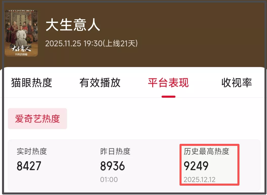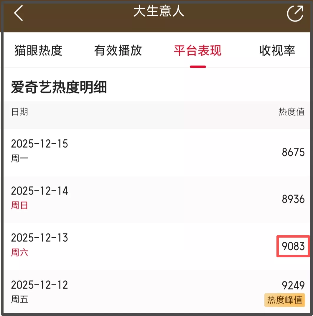 更让人哭笑不得的是,《大生意人》会员收官的日子是13号,这一天还是周六,可以称得上是热度上的话黄金时间。但是,该剧的热度在这一天却不增反降,收官日热度堪堪维持在9000以上。收官次日,也就是周日,该剧的热度直接跌破9000。完结之后,剧集的热度更是一跌再跌,该剧之后恐怕不会有太突出的长尾效应了。