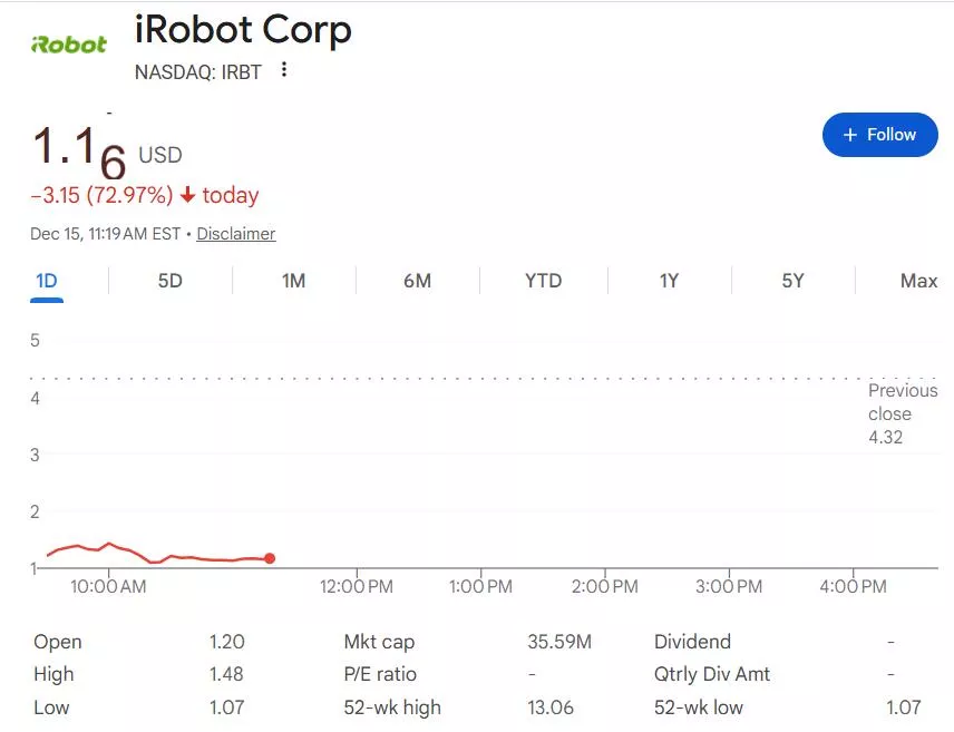 扫地机器人先驱iRobot公司周日申请破产保护,并计划由其中国主要供应商、代工厂接盘并退市。这家曾经市值高达35.6亿美元的公司股价周一开盘暴跌72%,早盘跌幅一度达75%。