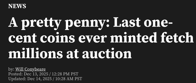 美国造币局(U.S. Mint)已正式停止生产一美分硬币,但最后一批铸造的便士(penny)在拍卖中身价不菲,吸引了众多收藏家竞相购买。 据报道,拍卖行Stack’s Bowers Galleries近日举办了一场特别拍卖,推出了232套三枚硬币组合。数字232寓意特殊,因为1793年是美国首枚便士铸造的年份,距今正好232年。