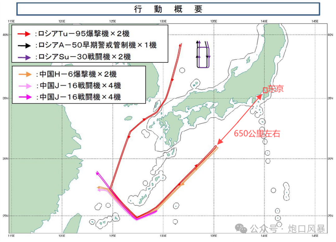 根据日本统合幕僚监部发布的航线说明可知,俄军的图95MS轰炸机是从远东地区出发,经过日本海,并穿过对马海峡,进入东海,然后在宫古海峡以西约200多公里的空域,与中国空军的轰6K轰炸机,以及护航的歼16战机汇合。
