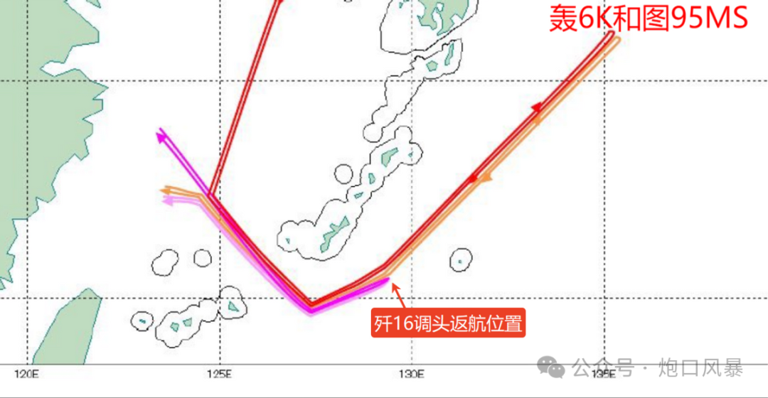 从日本发布的航线图可以看到,我军歼16战斗机在出宫古海峡后,很快就返航了。因为歼-16战机的作战半径大约是1500公里,只能护航到出宫古海峡就得返回。所以轰6K和图95MS轰炸机就面临出宫古海峡后没有战斗机护航的尴尬场面。