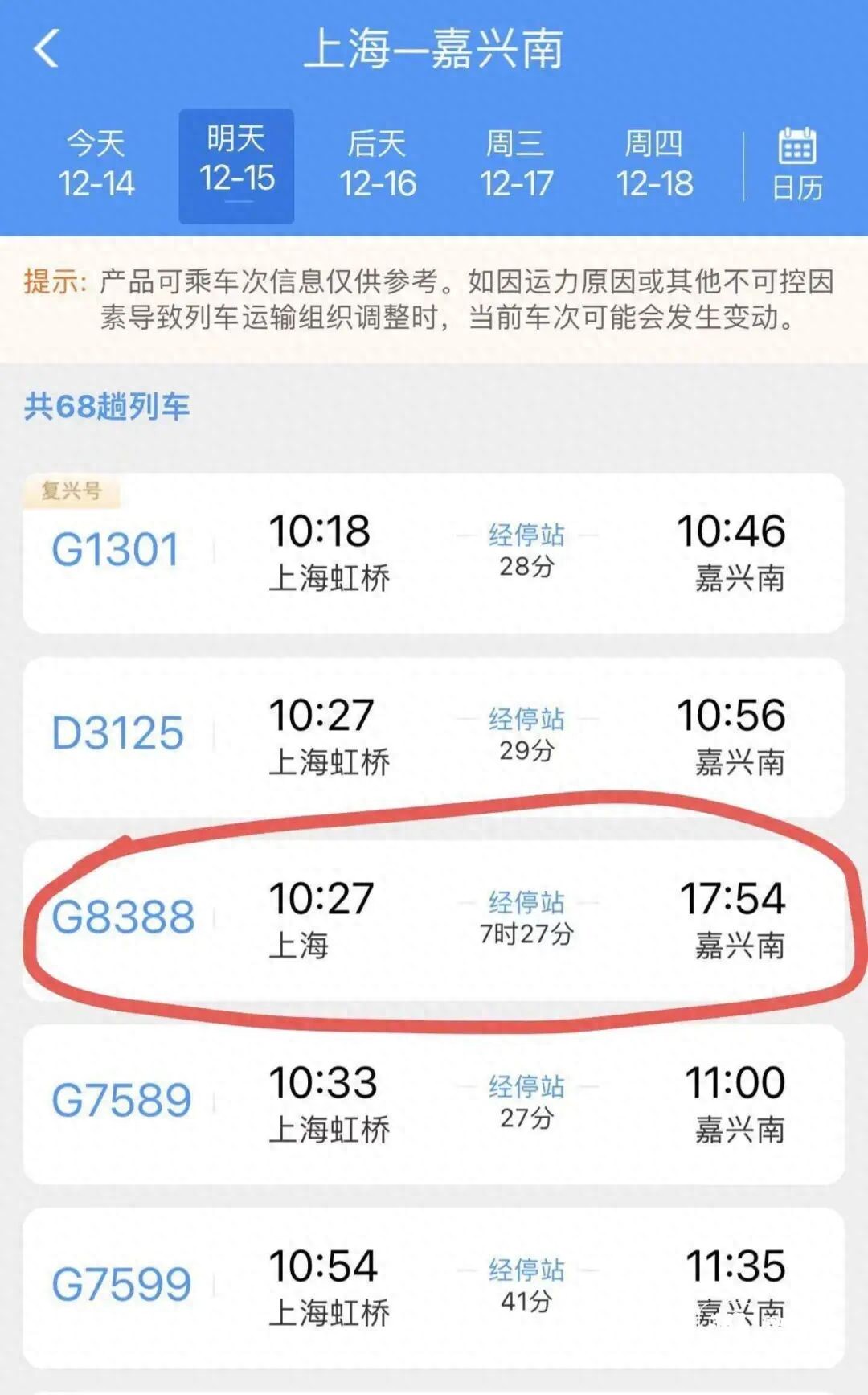 买上一张上海到嘉兴南的G8388次列车车票,只要61元,就能坐一等座,途经苏州、无锡、常州、南京、合肥、黄山、杭州等地,环游长三角一圈。二等座则仅需38元。