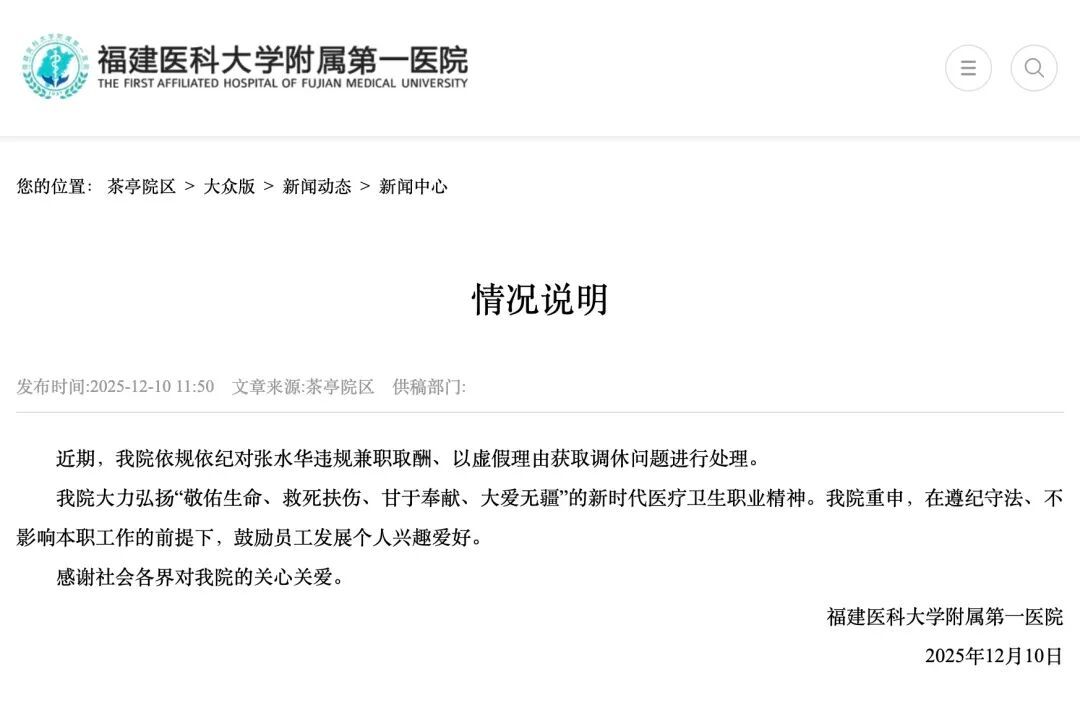 12月10日,福建医科大学附属第一医院官网发布情况说明:近期,我院依规依纪对张水华违规兼职取酬、以虚假理由获取调休问题进行处理。根据此前在网络流传的《福建医科大学附属第一医院关于对张水华的处理决定》,张水华被医院给予警告处分,为期6个月,并且2025年度考核不能确定为优秀档次。