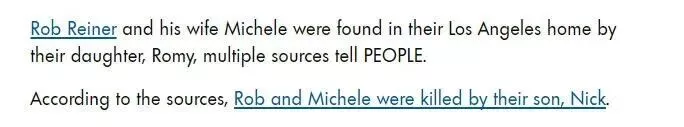 根据《人物》杂志的独家消息,杀死二人的竟然是他们的儿子,尼克·莱纳(Nick Reiner)。