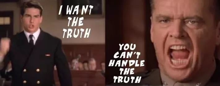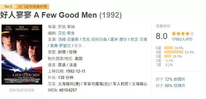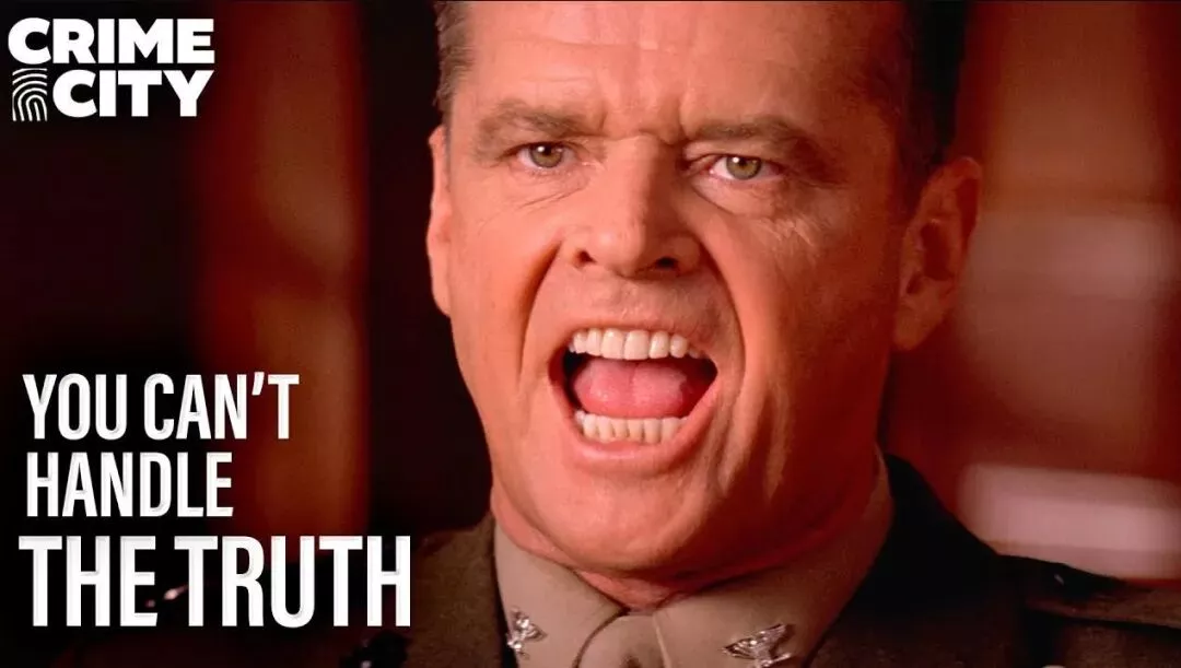 顺便一提,杰克·尼科尔森演员生涯最著名的两个梗,其一当然是《闪灵》劈门的名场面;第二就出自《好人寥寥》,是他和阿汤哥对戏时的一句台词,“You can't handle the truth”。