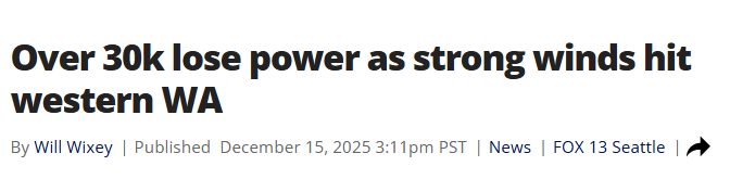 据报道,周一(15日),强风席卷普吉特海湾地区,导致超过3万户居民遭遇停电。