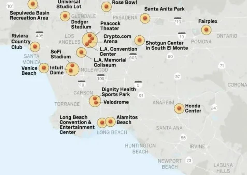 2028年洛杉矶奥运会赛事场馆位置。(LA28官网)