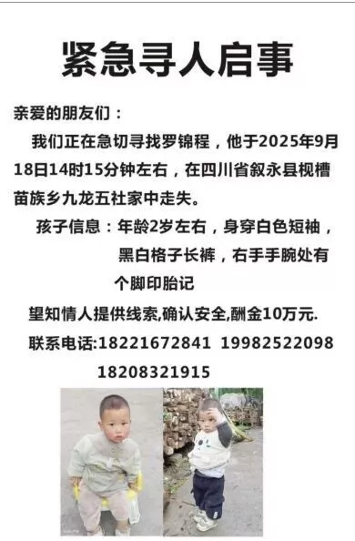 今年9月18日14时15分左右,四川省叙永县枧槽苗族乡九龙五社2岁的罗锦程从家中走失。寻人启事显示,当天他身穿白色短袖、黑白格子长裤,右手手腕处有脚印胎记。