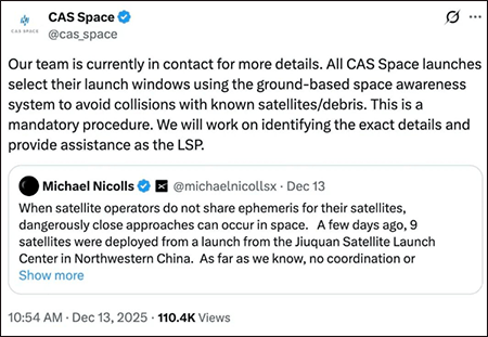 此番言论随即遭到前述发射服务提供商中科宇航的回击。中科宇航在社交媒体表示,其所有发射任务均会使用地面空间感知系统选择发射窗口,以避免与已知卫星或碎片发生碰撞,并强调这是一项强制性程序。
