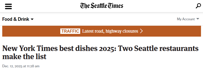 据悉,《纽约时报》在其2025年度“全美23道最佳菜肴”榜单中,收录了两道来自西雅图本地餐厅的美食,分别是巴拉德区Little Beast餐厅的羊颈肉咖喱派,以及怀特中心(White Center)Tomo餐厅的珍宝蟹饭。