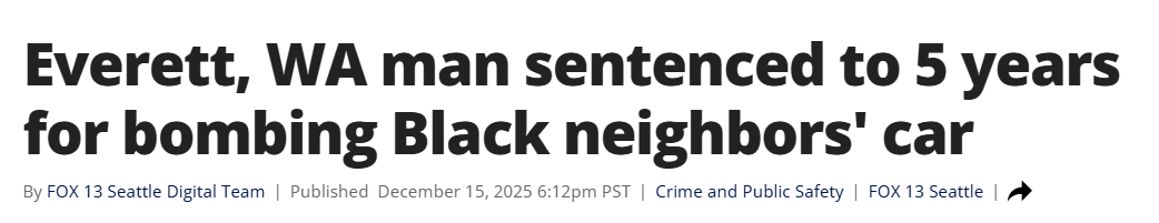 近日,华盛顿州埃弗里特(Everett)一名55岁男子因使用管状炸弹炸毁一对非裔夫妇的汽车,而被判处5年监禁。