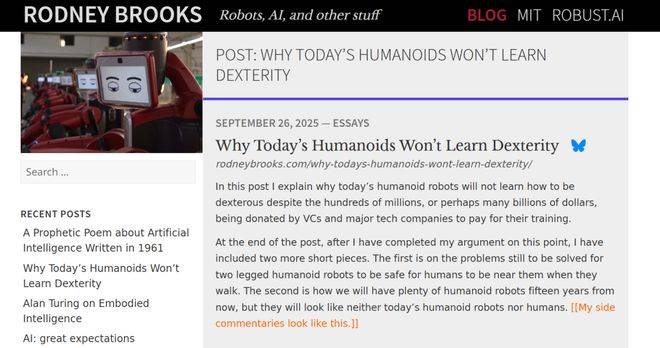 事实上,这并不是 Brooks 第一次向人形机器人泼冷水,去年 9 月,其在个人博客上发表了一篇数万字的技术檄文:《为什么今天的人形机器人学不会灵巧性》(Why Today's Humanoids Won't Learn Dexterity)。