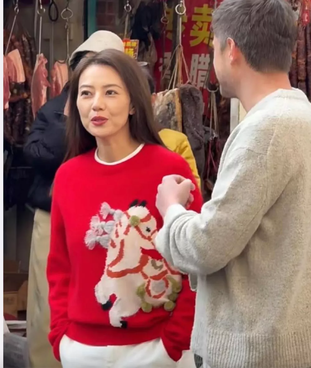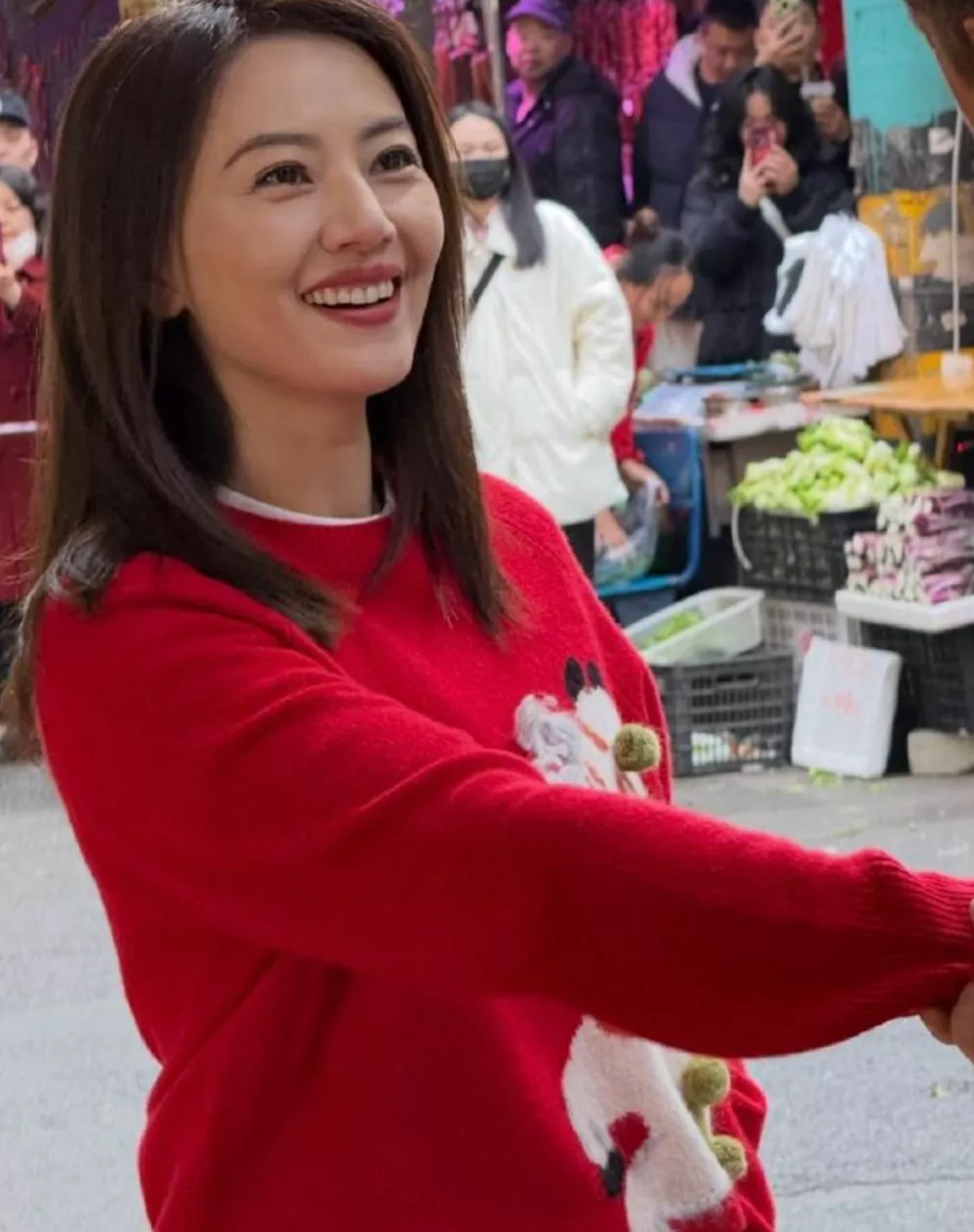她身穿一件大红色的很喜庆的卫衣,下身搭配的是一条简单的白色长裤,披散着黑色长发,整个人都是很减龄很年轻的。