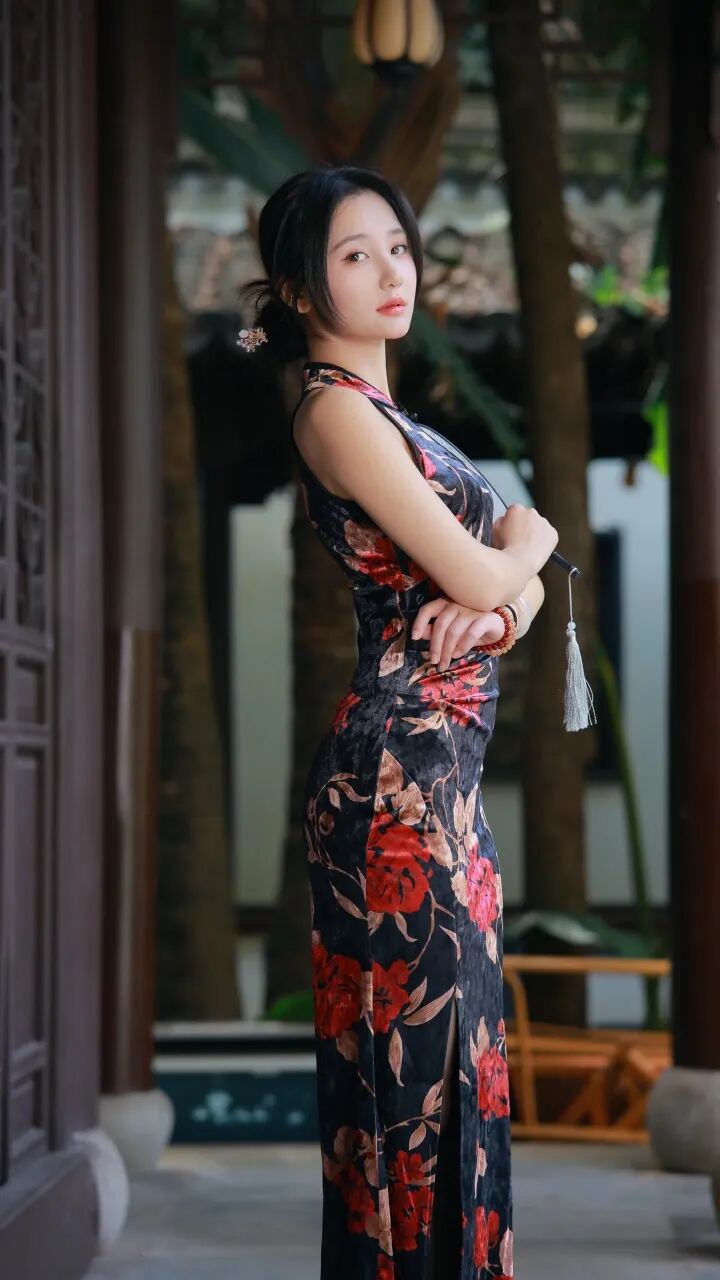 站在中式庭院的廊柱旁,身体轻轻往廊柱侧倚(别贴太实,留点儿松弛的弧度),双臂自然抱在胸前(别攥太紧,松松搭着就行),旗袍的红花纹理衬着廊柱的木色,腕间的流苏轻晃 —— 庭院的光影打在旗袍上,抱臂的姿态卸了所有僵硬,温婉得像从旧庭院里走出来的姑娘,完全没摆拍的刻意~