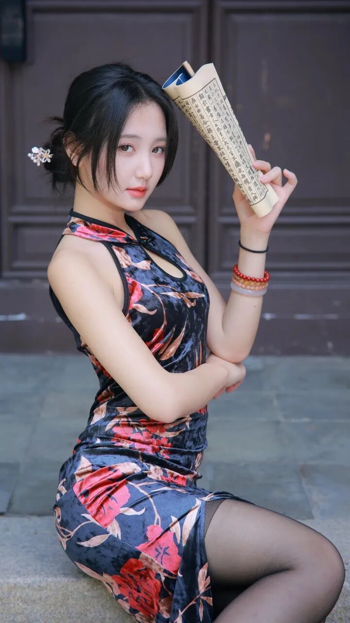 蹲坐在庭院的石阶上,一只手松松握着书卷抵在肩旁,另一只手轻搭在腿上,旗袍的开叉顺着蹲姿露一点弧度,石阶的粗粝衬着旗袍的柔滑 —— 持书卷的动作不用绷着,松松握着就够雅致,庭院的光影裹着画面,像刚蹲下来翻书卷的悠闲样子~