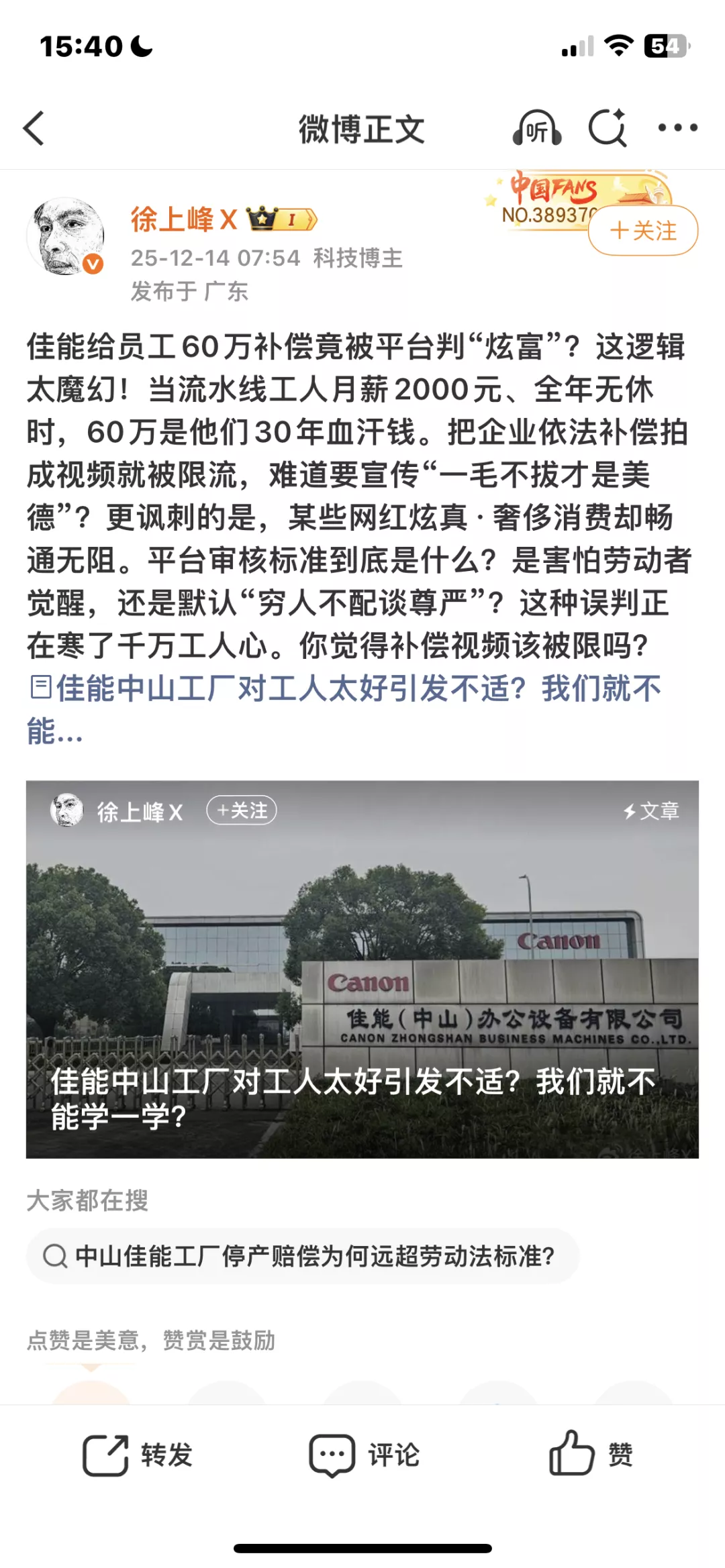 真正的富豪在视频里不经意地露出方向盘上的三叉星徽,背景是半山豪宅,那叫“分享美好生活”。一个工人,用18年青春换来一笔法律本应保障、但多数人从未足额见过的离职补偿,这叫“炫富”,污染社区精神。