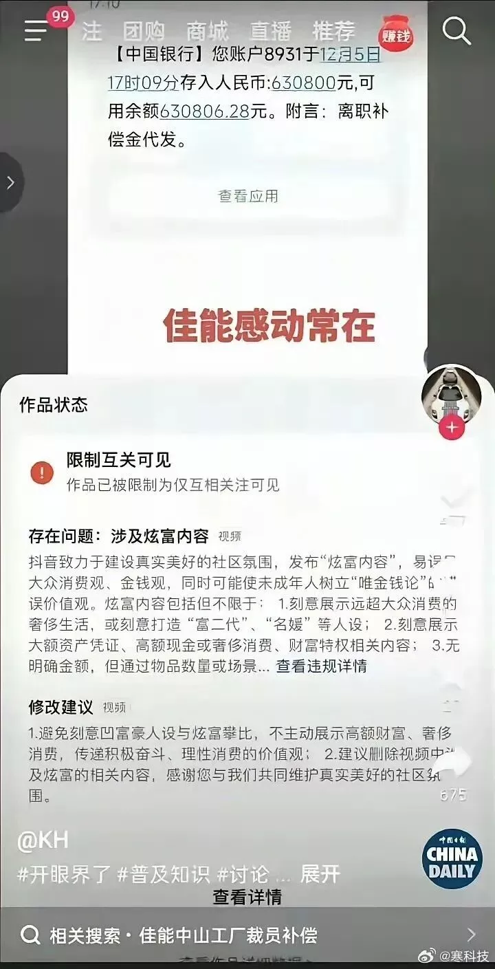 然后,抖音一纸判书落下:“涉及刻意展示大额资产凭证,违反社区规范,予以限制。”换句话说,平台认定他“炫富”。