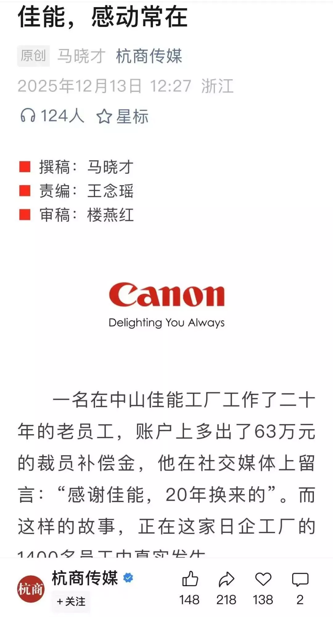 一张银行到账短信截图,让2025年末的中文互联网提前过了个“酸辣年”。短信显示:630800元已到账,此为离职补偿金代发。发款方是佳能(中山)。