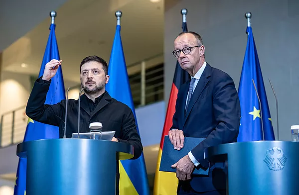 当地时间12月15日,泽连斯基和默茨在柏林出席新闻发布会 视觉中国