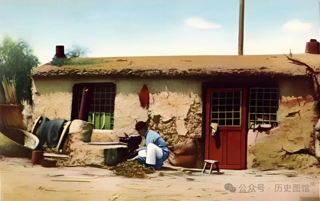 30年代,东北农村一户人家的房子。当时条件差,大部分都是这种土坯房。屋里烧的有炕,很暖和。男主人正在房前烧火做饭。