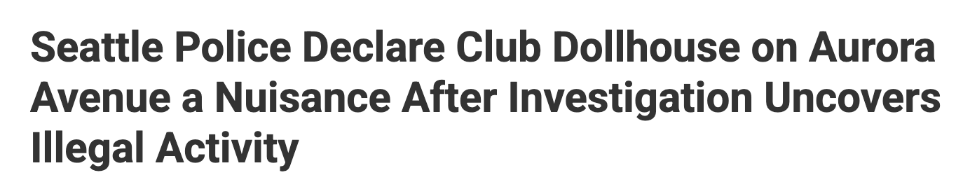 西雅图警察局近日宣布,位于Aurora Avenue North 10338号的脱衣舞俱乐部Club Dollhouse,已被正式认定为“长期滋扰场所”。12月8日,市政府已向该俱乐部经营者发出正式通知,要求其在七日内作出回应,并与政府达成整改协议,否则将面临进一步法律后果。