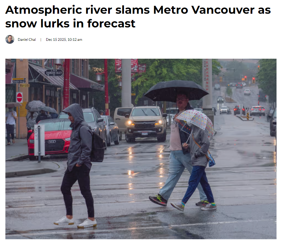 加拿大环境与气候变化部(ECCC)表示,一股锋面系统自周日开始影响卑诗省南海岸,并将持续到周一(12月15日)。目前,大温地区正受到一种被称为“大气河流”的天气系统影响,这种系统也常被称为“菠萝快车”,以带来持续、强烈降雨而闻名。