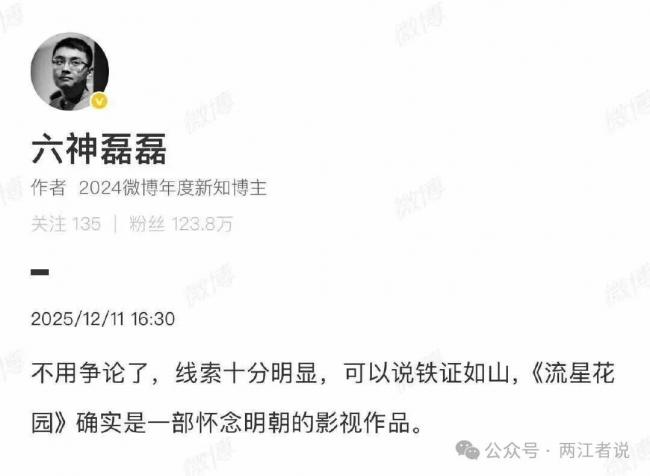 这是此次事件的肇始,大家都可以看到六神磊磊是在反讽,针对当下类似红楼和明朝等等拉倒一起的解读,他在文中把《流星花园》的人物情节与明朝历史进行了强行“缝合”,创造出“道明寺”即“悼明”、“红纸条”怀“朱明”等荒诞梗。这显然是一次充满机锋的幽默创作,意图是娱乐与启发,而非提供严谨史实。但凡有点智商的读者都能欣然一笑。