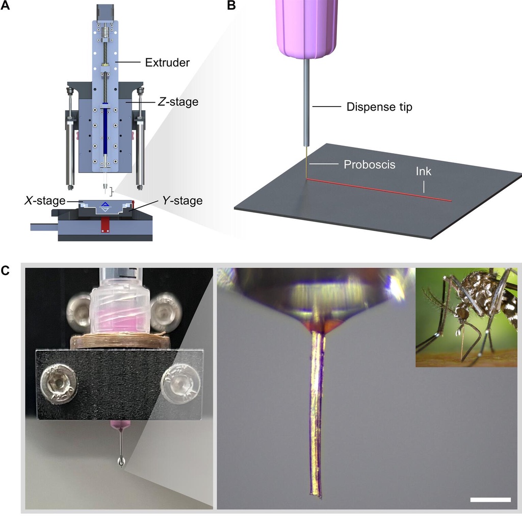 雌蚊子口器内部的直径只有20到30微米,比大多数毒针和尖牙都小许多,而且结构笔直,非常适合作为喷嘴对准。硬度和强度也足够,能抵抗打印时的压力。