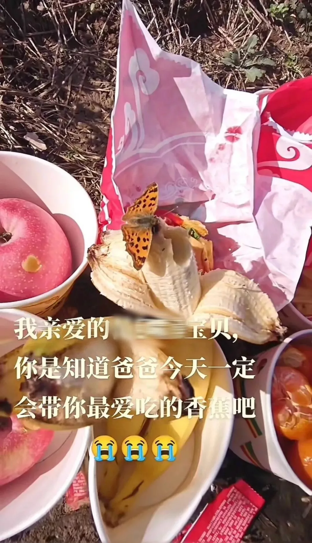 印象深刻的是2025年10月1日,他去给孩子上坟时,突然有只蝴蝶落在孩子生前最喜欢吃的香蕉上,直到他们离去都没飞走。