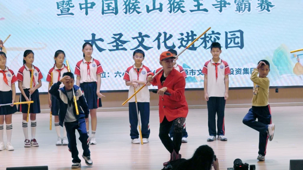 一次大圣文化进校园活动上,六小龄童与学生交流。