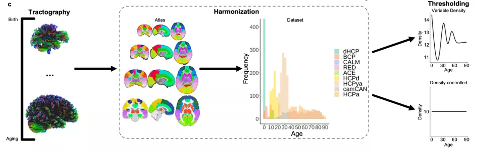 光这样还不够,因为数据来自于9个不同的大项目,不同项目扫描的深度不同,扫出的纤维密度也就不一样,因此直接比较会出现较大的误差。研究人员使用批次校正以及阈值和密度控制,把每个大脑的纤维密度减少到相似的程度,这样,每个被试的大脑就都变成了可以直接对比的网络图。