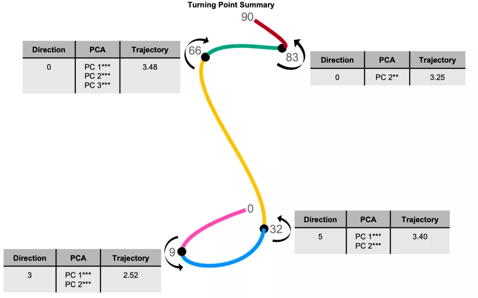 通过比较这条轨迹在哪些年龄段发生明显转向,研究者就可以识别出大脑结构网络在一生中的关键拐点,并据此划分出不同的发育阶段。