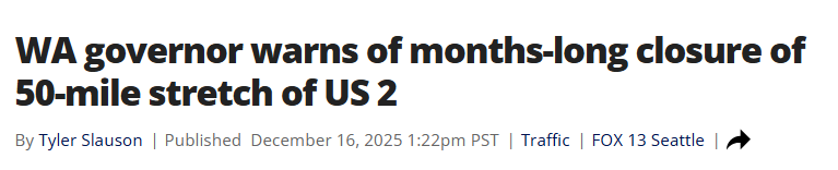 他表示:“我们预计US 2公路将封闭数月之久,目前准确估算封闭时长仍为时过早,但这显然是一条重要干道。我们理解这条公路长期中断对商业运营、民众生活乃至生命安全造成的重大影响。”
