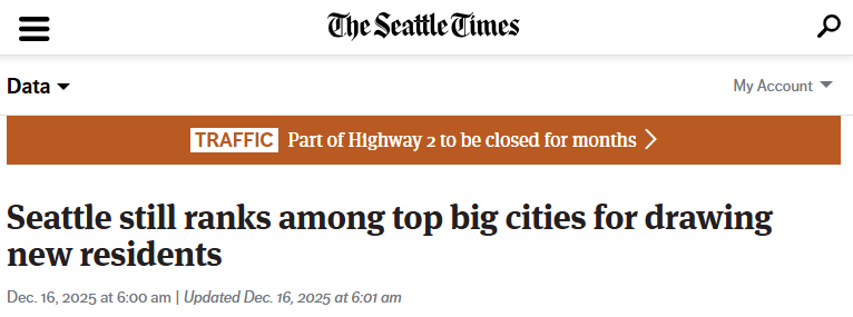 西雅图在吸引外州新居民方面持续领先。在美国50个最大城市中,西雅图居民中一年前居住在其他州或国家的比例位列第三高,仅次于华盛顿特区和波士顿。