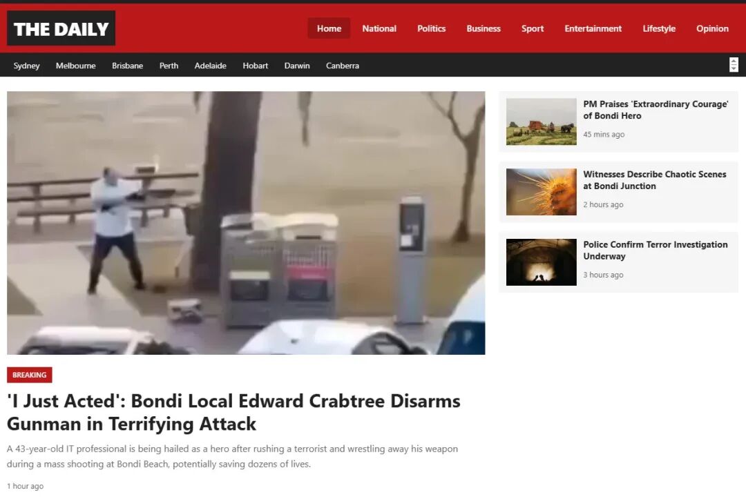 悉尼邦迪海滩(Bondi Beach)在2025年12月14日周日的午后发生了惨烈枪杀事件,两名暴徒手持武器闯入犹太社群,瞬间将这片金色的沙滩变成了修罗场。 就在枪击案发生的几个小时后,当全世界都在焦急地寻找那位挺身而出夺枪的平民英雄时,互联网上却开始传播起一则荒唐的“狸猫换太子”新闻。 一个名叫“爱德华·克拉布特里(Edward Crabtree)”的名字开始在社交媒体平台X(前推特)上病毒式传...